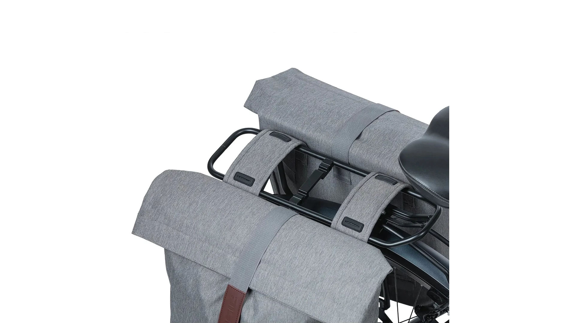 A Basil City dupla oldaltáskát egyszerűen rögzítheted a csomagtartóra a Universal Bridge rendszer segítségével. Ennek köszönhetően többféle rögzítési mód közül választhatsz: felszerelhető az előre rögzített pántokkal, a Basil DBS rendszerrel (levehető csomagtartólemezek), vagy adapterlemezzel, például MIK rendszerrel. Ezek a rendszerek külön vásárolhatók meg.