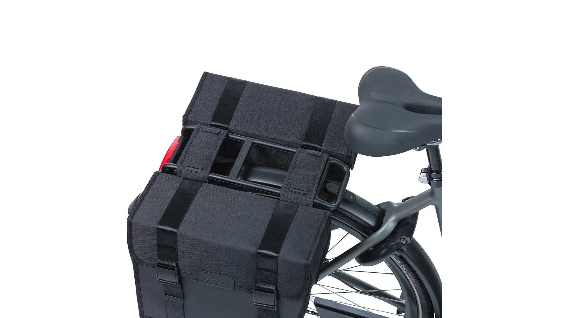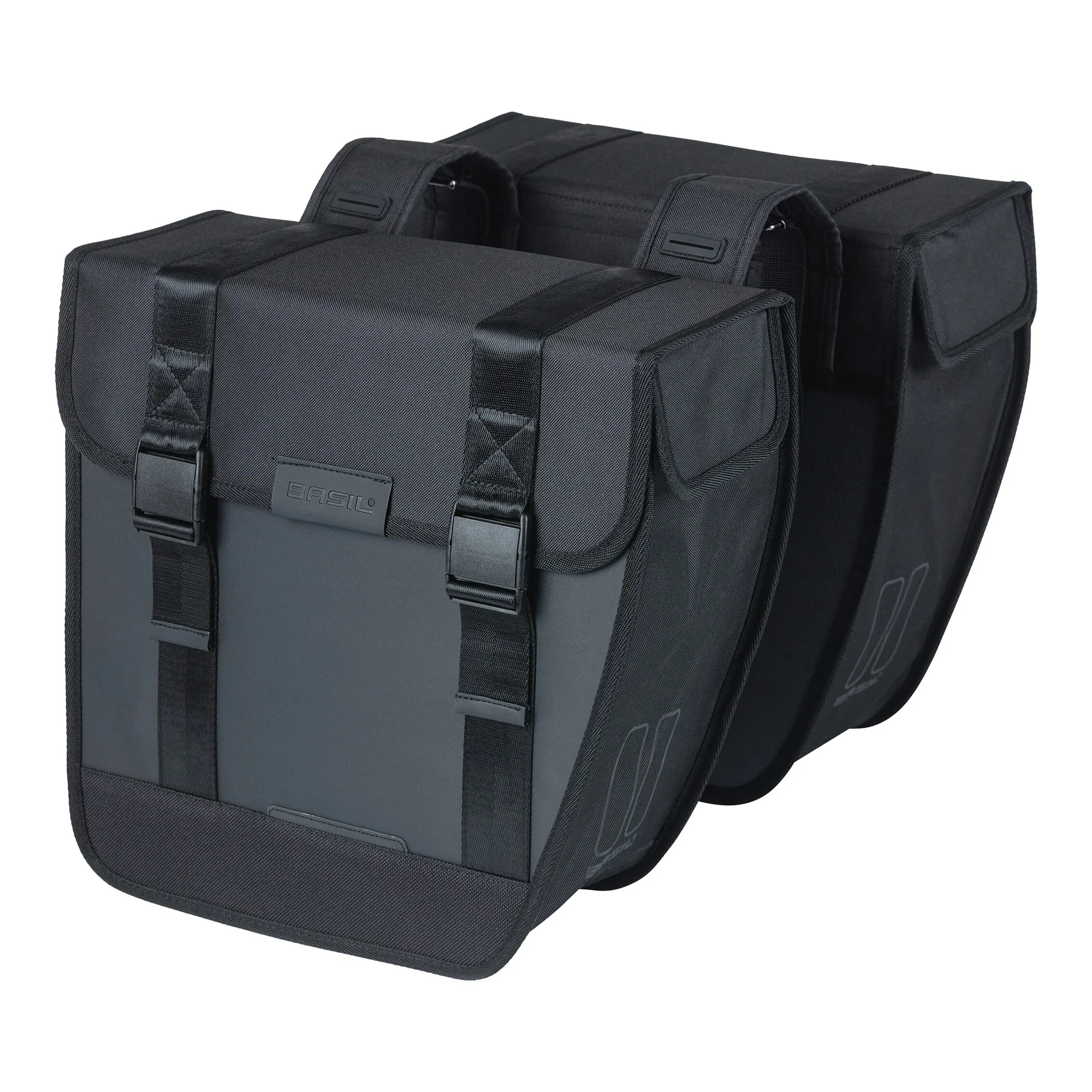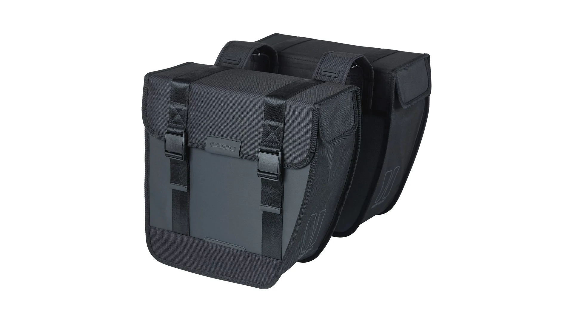 A dupla oldaltáska vízlepergető 600D poliészter és tarpaulin anyag kombinációjából készült, így mérettartó és tartós. Jellegzetes, lekerekített első része megakadályozza, hogy tekerés közben a sarkad a táskához érjen. A könnyen kezelhető csatos záródásnak köszönhetően a táska egyszerűen nyitható, nagyobb erőkifejtés nélkül. A Universal Bridge rendszerrel többféleképpen is rögzíthető a kerékpárra, akár az előre felszerelt pántokkal, akár a Basil DBS rendszerrel (levehető csomagtartó lemezek), illetve más adapterekkel, például MIK rendszerrel. Ezek a rendszerek külön vásárolhatók meg. Ha nehezebb csomagot szállítasz, a táska kombinálható a Basil Distance Holder tartóval (külön megvásárolható), amely megakadályozza, hogy a táska a küllők közé kerüljön.