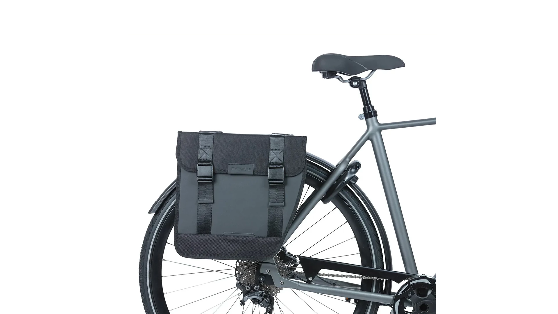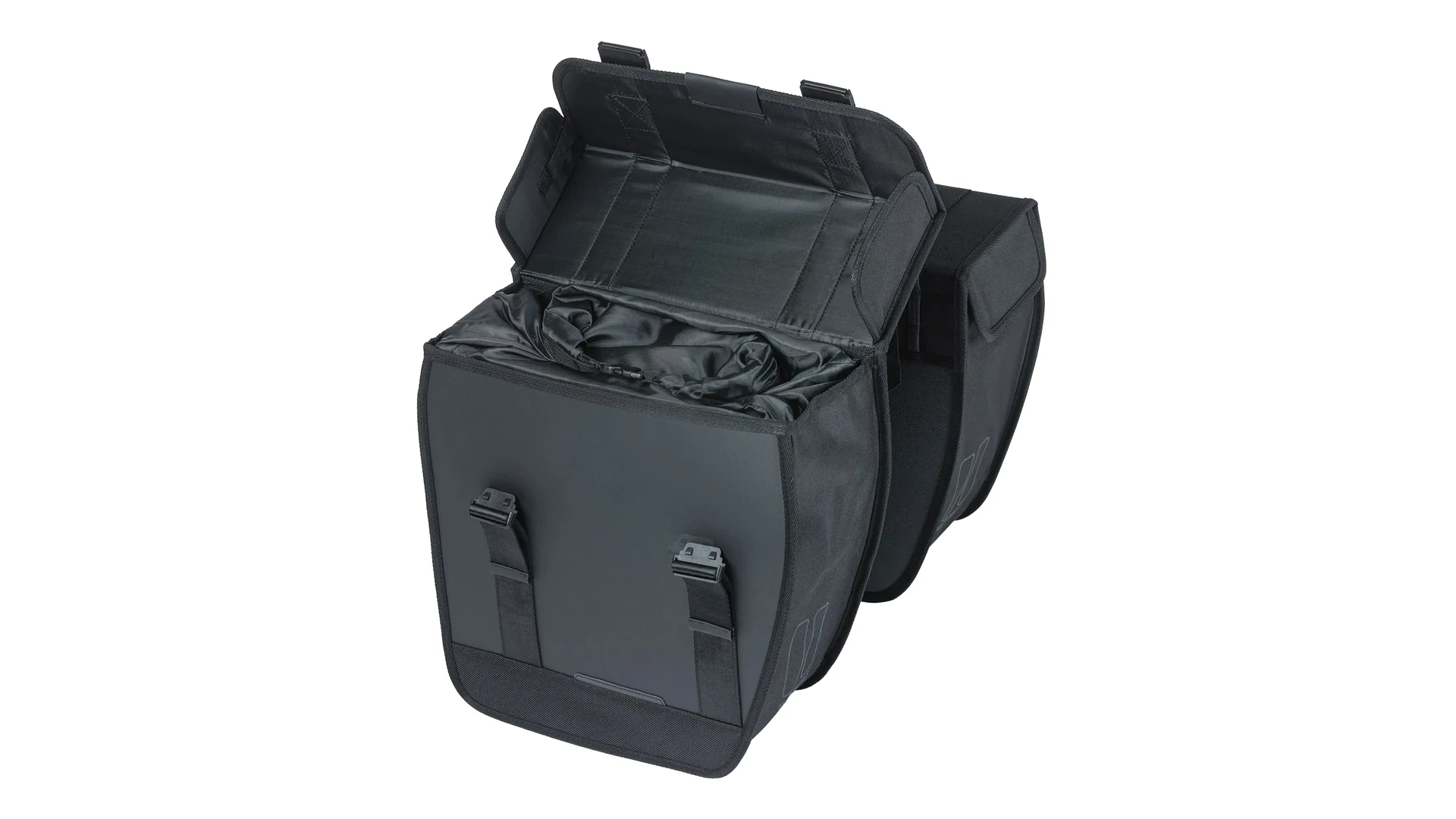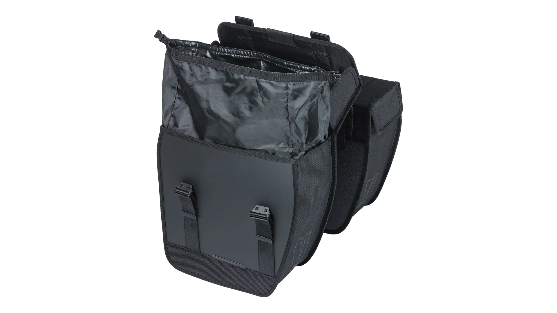 A dupla oldaltáska vízlepergető 600D poliészter és tarpaulin anyag kombinációjából készült, így mérettartó és tartós. Jellegzetes, lekerekített első része megakadályozza, hogy tekerés közben a sarkad a táskához érjen. A könnyen kezelhető csatos záródásnak köszönhetően a táska egyszerűen nyitható, nagyobb erőkifejtés nélkül. A Universal Bridge rendszerrel többféleképpen is rögzíthető a kerékpárra, akár az előre felszerelt pántokkal, akár a Basil DBS rendszerrel (levehető csomagtartó lemezek), illetve más adapterekkel, például MIK rendszerrel. Ezek a rendszerek külön vásárolhatók meg. Ha nehezebb csomagot szállítasz, a táska kombinálható a Basil Distance Holder tartóval (külön megvásárolható), amely megakadályozza, hogy a táska a küllők közé kerüljön.