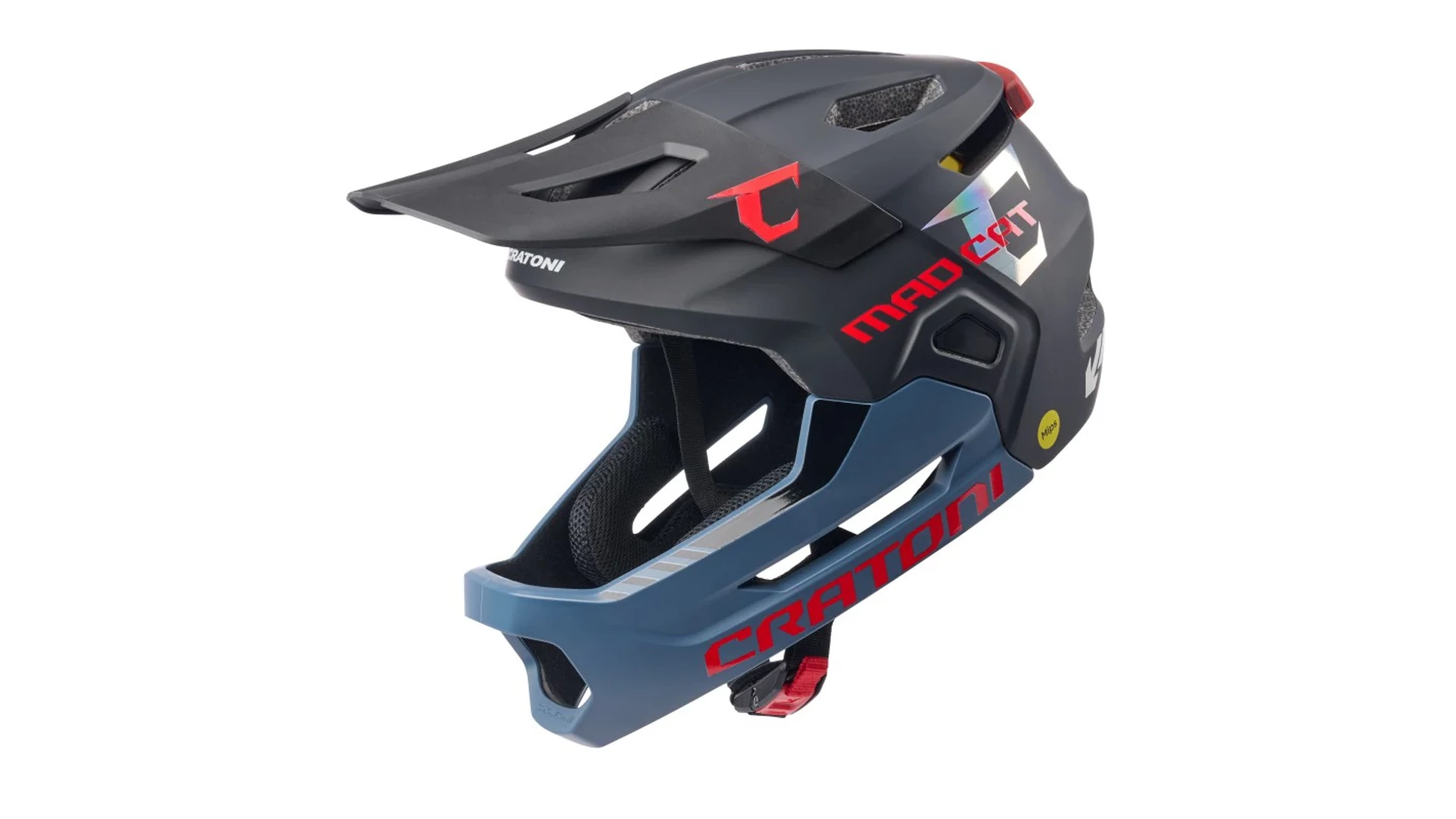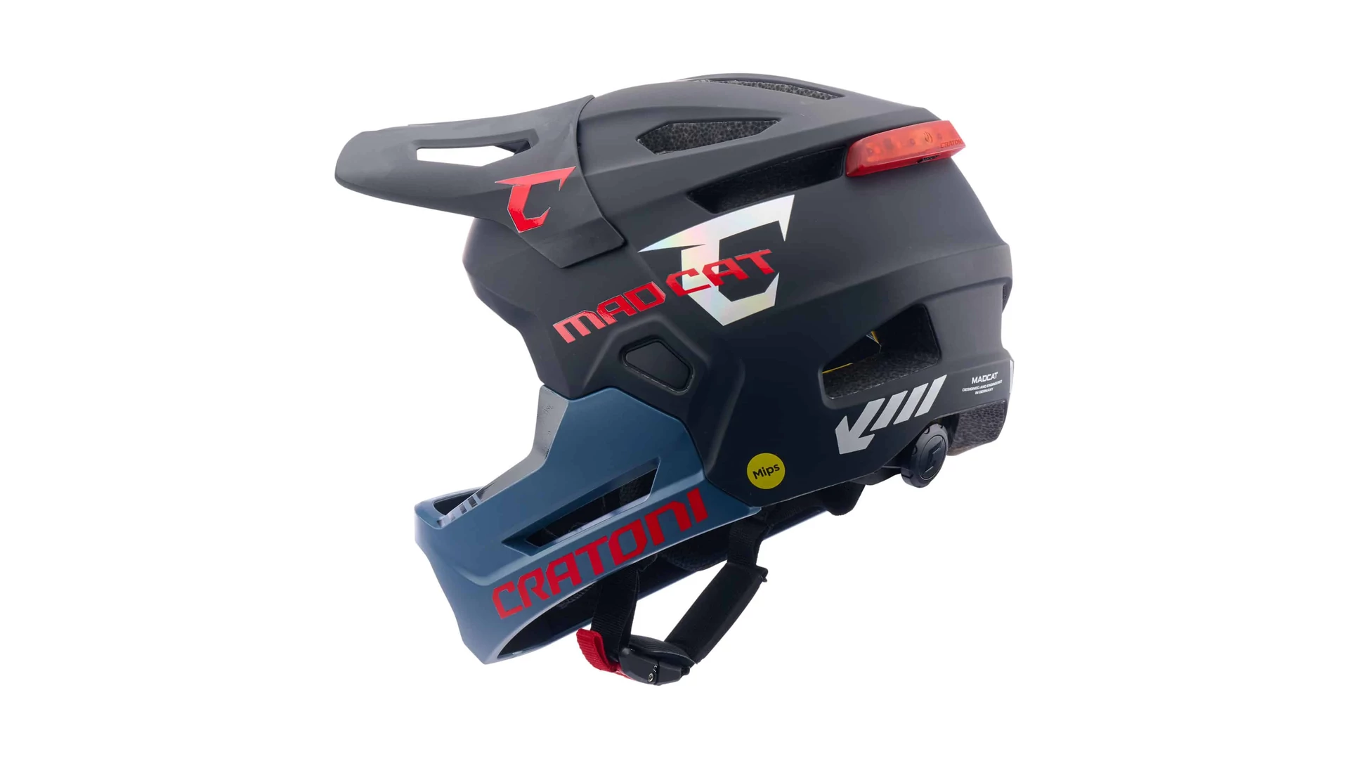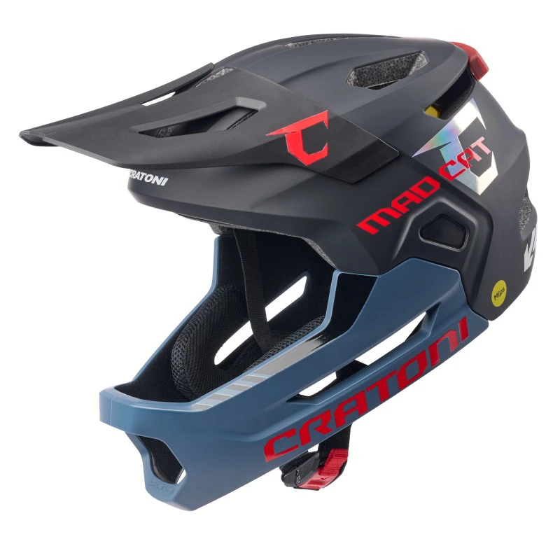 A CRATONI Madcat MIPS kerékpáros sisak egy prémium védelmet nyújtó full-face modell, amely ideális választás fiatal, sportos bringások számára. A MIPS technológia és a megnövelt hátsó védelem fokozott biztonságot biztosít minden helyzetben. A szerszám nélkül eltávolítható állvédő lehetővé teszi a sokoldalú használatot, legyen szó lejtőzésről vagy nyugodtabb tekerésről. Az integrált, USB-C-vel tölthető hátsó lámpa növeli a láthatóságot.