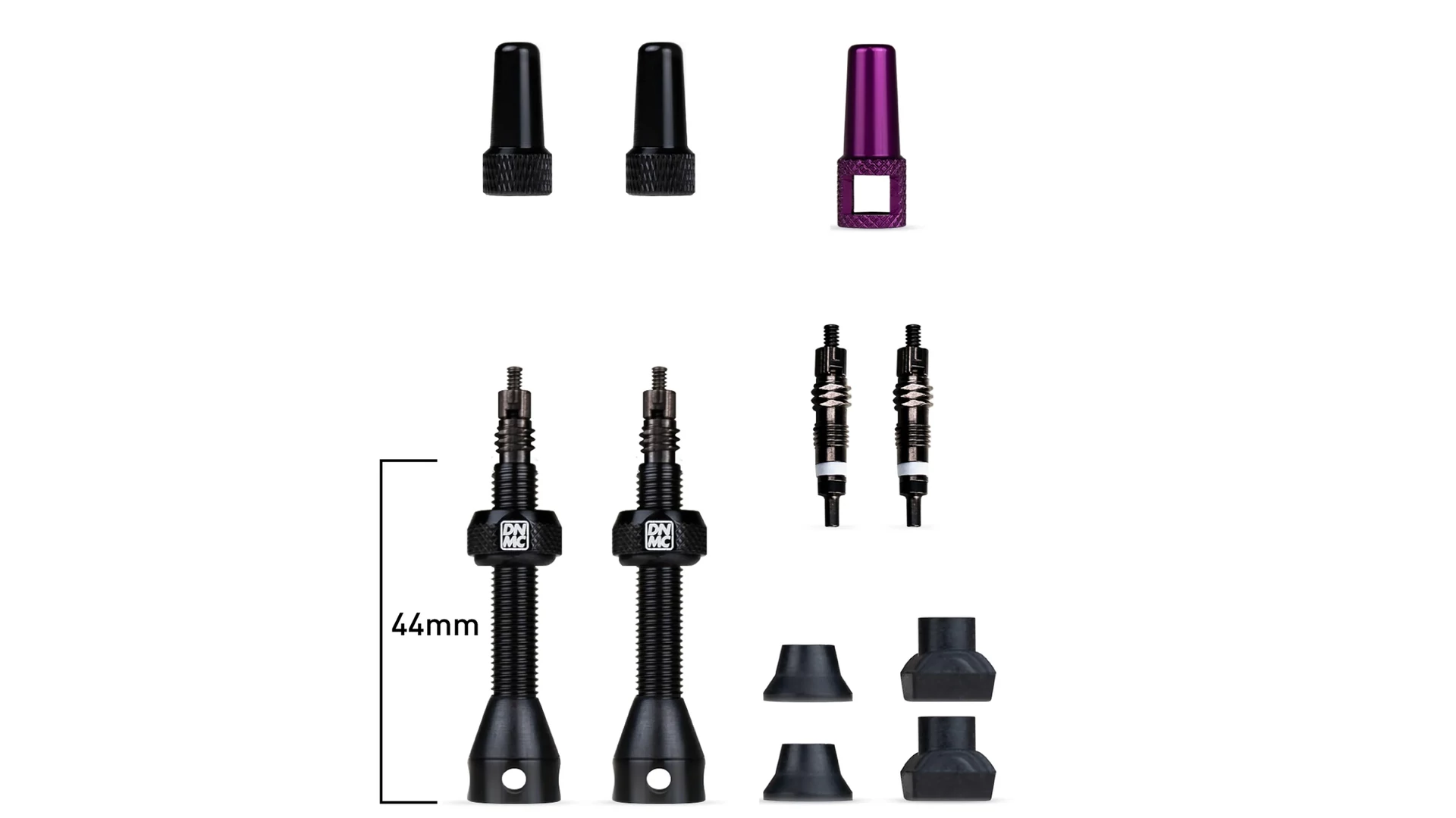 • 2 db komplett tubeless szelep (fekete szelepmagokat, ultrakönnyű szelepfedőket, gumi alapokat, O-gyűrűket és rögzítőgyűrűket).