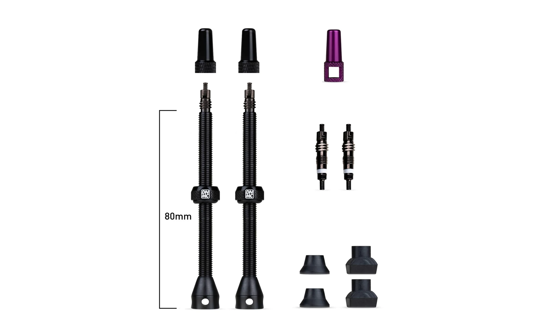 - 2 db komplett tubeless szelep (fekete szelepmagokat, ultrakönnyű szelepfedőket, gumi alapokat, O-gyűrűket és rögzítőgyűrűket).