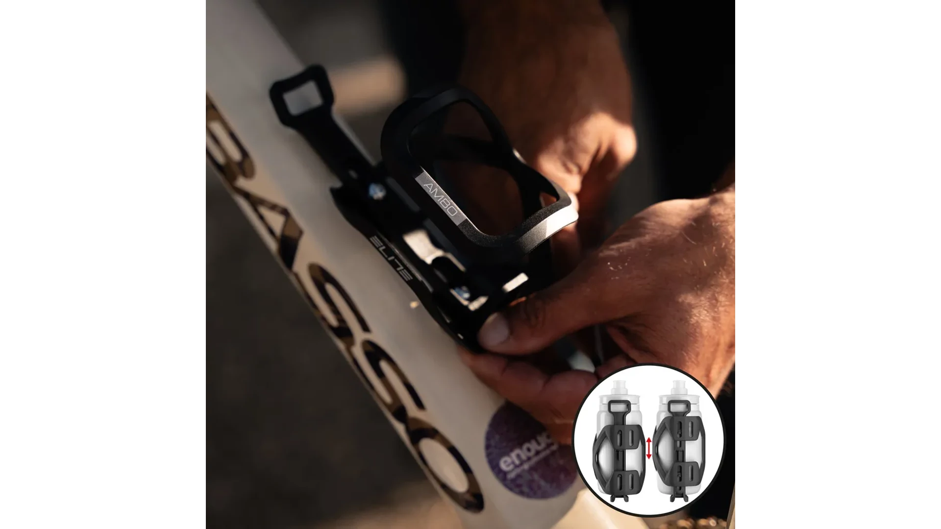 Az Ambo az Elite új, oldalról tölthető kulacstartója, amely megfordítható kialakításának köszönhetően lehetővé teszi a kulacs behelyezését jobb vagy bal oldalról is. Ez az egyedülálló megoldás eddig nem látott szintű testreszabhatóságot kínál, így a felszerelésedet pontosan a saját igényeidhez igazíthatod.