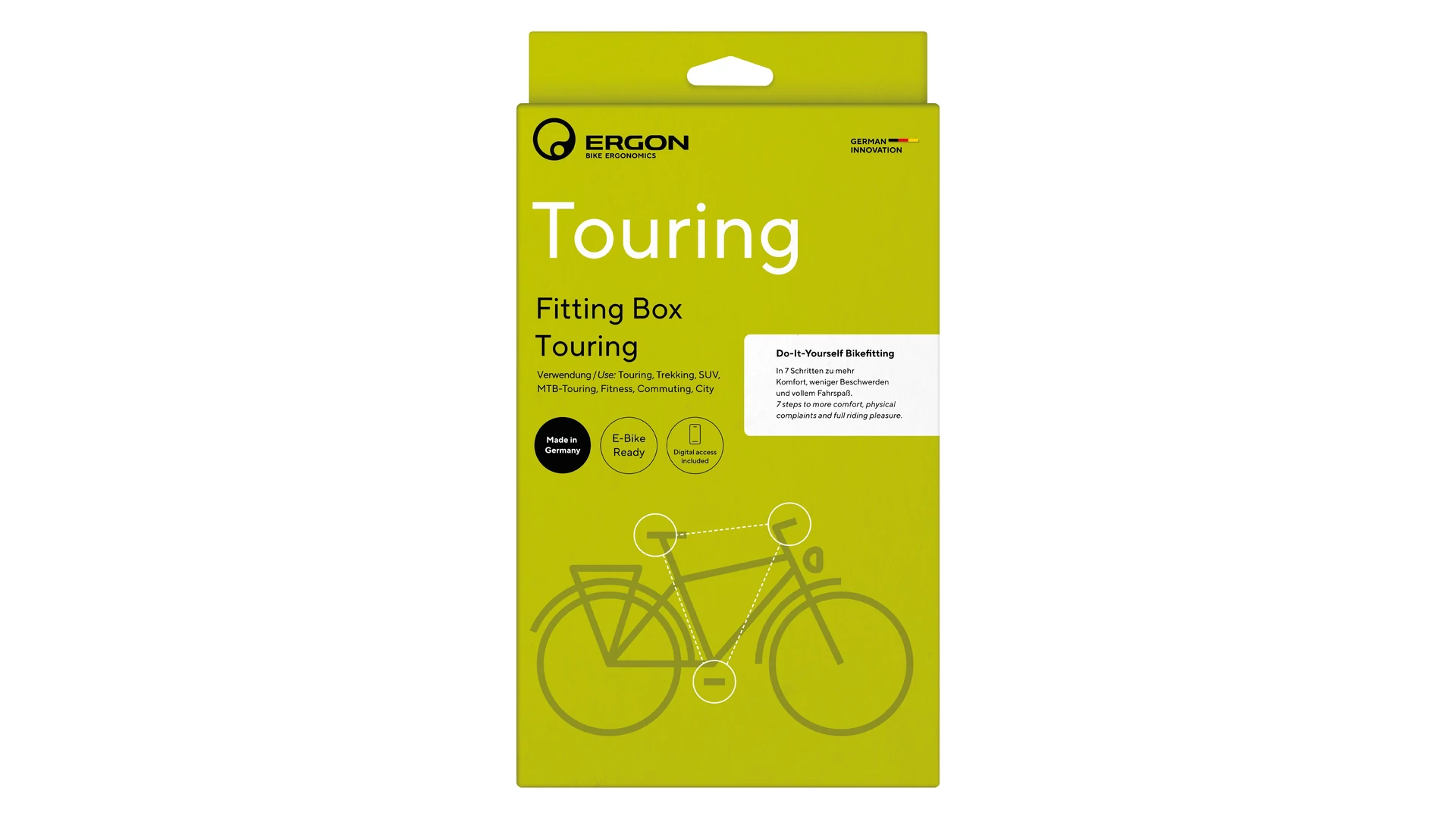 A fájdalommentes tekeréshez a nyereg, a kormány és a pedálok érintkezési pontjait a testedhez és a tekerési stílusodhoz kell igazítani. A Fitting Box „Touring” változata a túrakerékpárok széles skáláját lefedi – a városi, trekking és túrakerékpároktól egészen a fitness és e-bike modellekig.