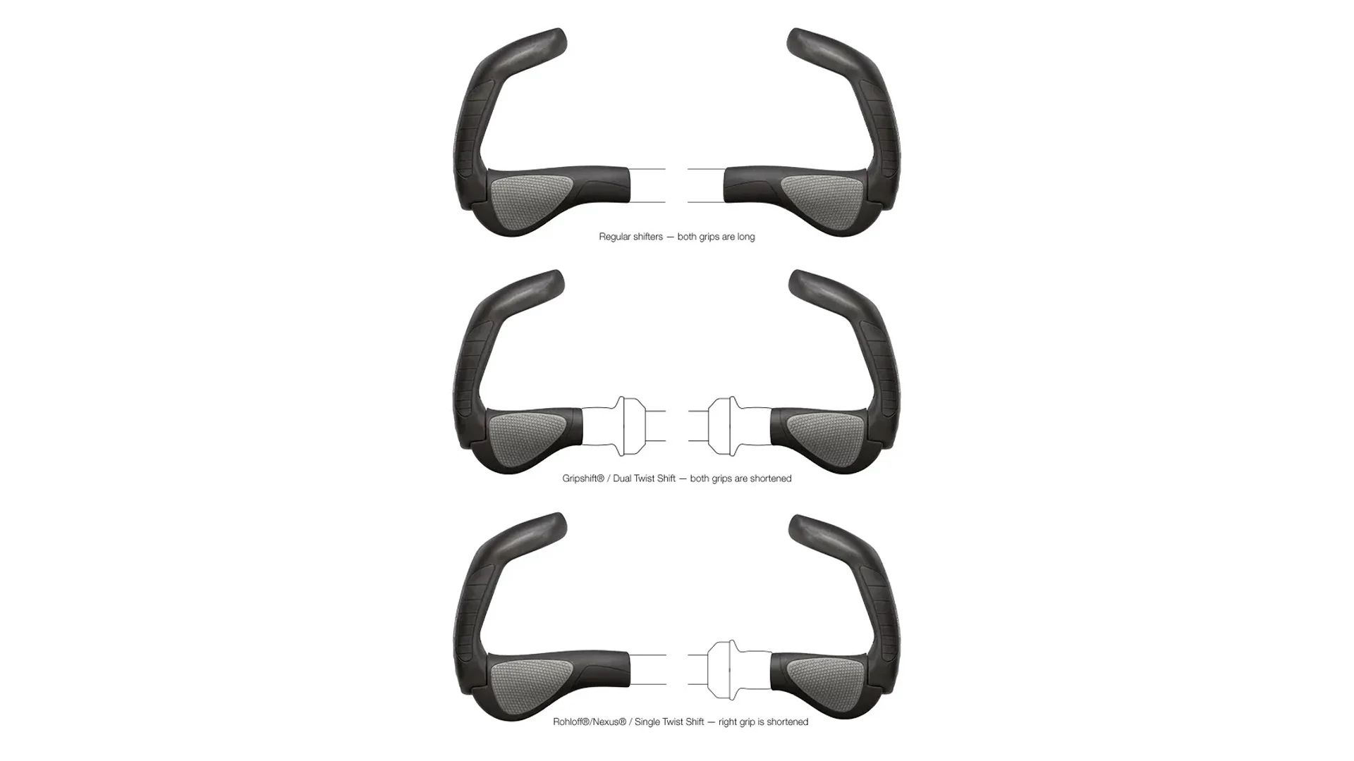 A GP sorozat markolatai különböző változatokban is elérhetők, amelyek kompatibilisek különféle markolatváltó rendszerekkel. Hagyományos váltókarok esetén mindkét oldal azonos hosszúságú. Gripshift® és Dual-Twist váltóknál két rövidebb markolatot kapunk, míg Rohloff®, Nexus® és Single-Twist rendszereknél a jobb oldali markolat rövidebb, hogy helyet biztosítson a váltómechanikának.