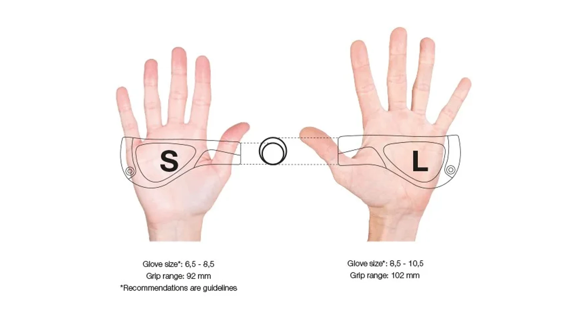 A tökéletes irányítás érdekében fontos, hogy a kéz ne zárja teljesen körbe a markolatot. Ezért az Ergon több markolatát két méretben kínálja: Small és Large. A különbség a markolat vastagságában van. A nagyobb kézhez vastagabb markolat illik, míg kisebb kézhez a vékonyabb változat ideális. 6.5-8.5 kesztyűmérethez a Small, 8.5-10.5 mérethez általában a Large ajánlott.