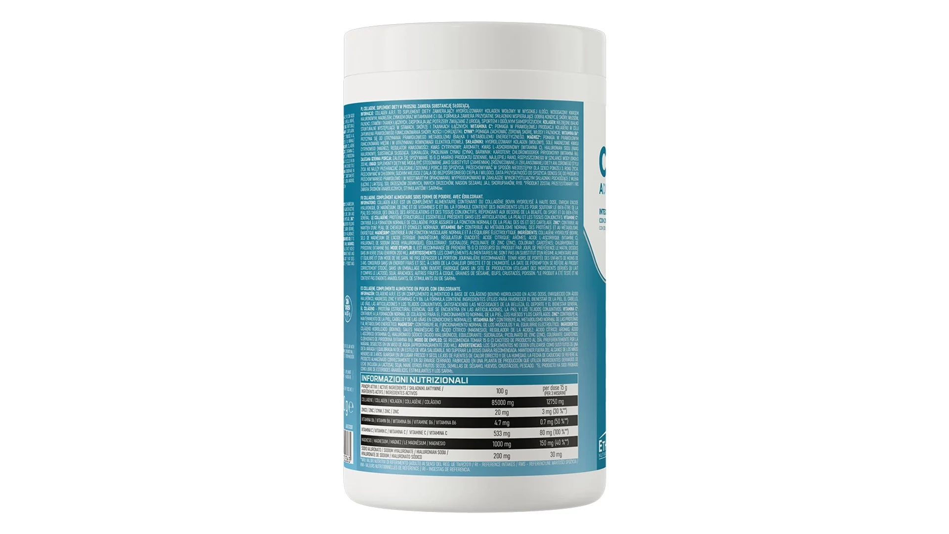 hidrolizált kollagén (szarvasmarhából), citromsav magnézium sói (magnézium), savanyúságot szabályzó anyag: citromsav; aromák, l-aszkorbinsav (C-vitamin), nátrium-hialuronát (hialuronsav), édesítő: szukralóz; cink-pikolinát (cink), színezék: karotinok; piridoxin-klórhidrát (B6-vitamin).