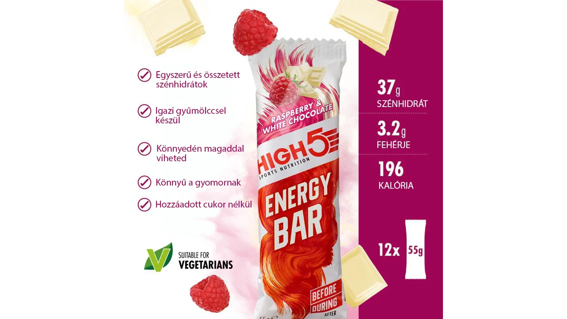 A High5 Energy Bar málna/fehér csoki egy kimondottan edzésre fejlesztett energiaszelet, magas szénhidrát-tartalmú, nagyon alacsony zsírtartalommal, és megvan az egyszerű és komplex szénhidrátok egyensúlya, hogy biztosítsa a gyors felszívódást és a hosszantartó hatást egyaránt.