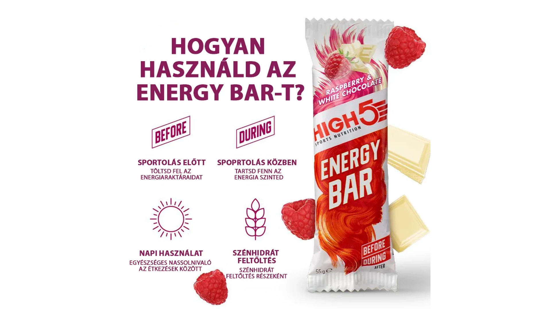A High5 Energy Bar málna/fehér csoki könnyű a gyomornak, könnyen rágható és megőrzi nedvességtartalmát, nem szárad ki. Érdekes tény: az Energy Bar alacsony zsírtartalmát egészséges zsírokból nyerik, azaz zab, napraforgó olaj és speciális kókuszolajból (magas MCT-tartalmú – közepes láncú trigliceridek). Ideális szénhidrát töltéshez. Az Energy Bar-t több ezer atléta tesztelte szerte a világon, és jobbnak bizonyult minden más energiaszeletnél. Ennek az intenzív kutatás-fejlesztésnek köszönhető, hogy az utóbbi 5 évben a „Legjobb Termék Díj”-at elnyerte.