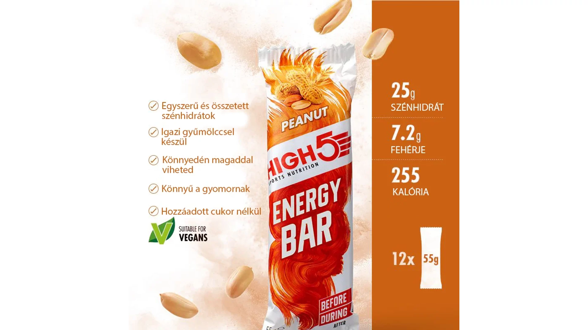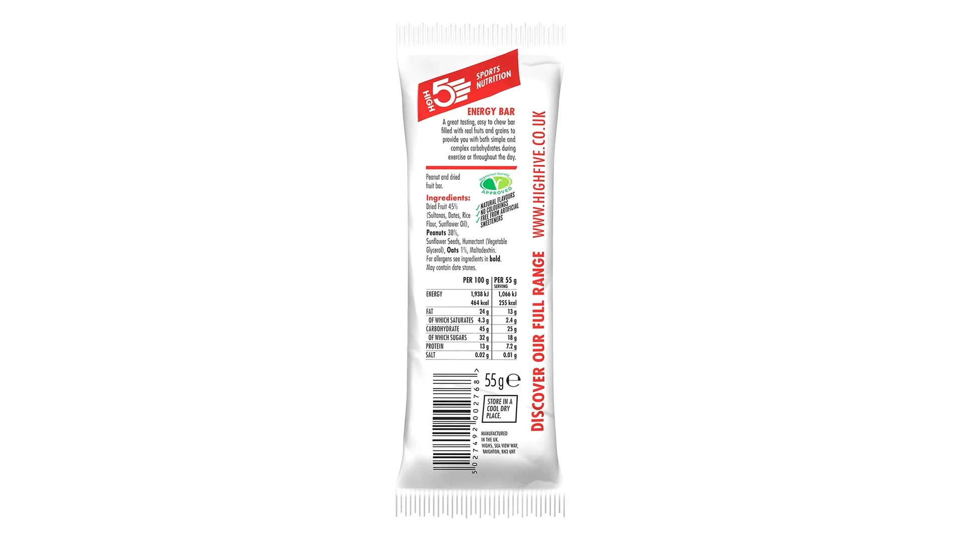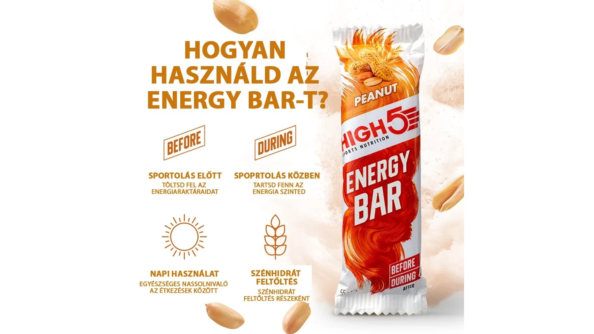A High5 Energy Bar, egy kimondotan versenyzésre fejlesztett energia szelet, magas szénhidrát-tartalmú, nagyon alacsony zsírtartalommal, és megvan az egyszerű és komplex szénhidrátok egyensúlya, hogy biztosítsa a gyors felszívódást és a hosszantartó hatást egyaránt.