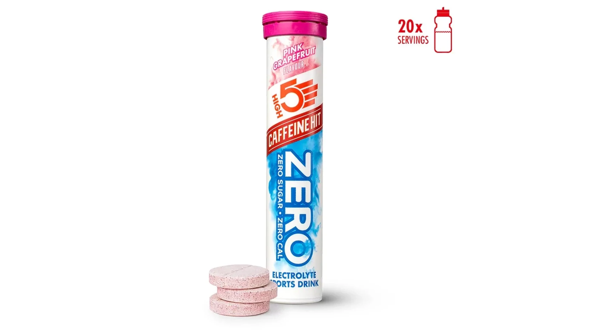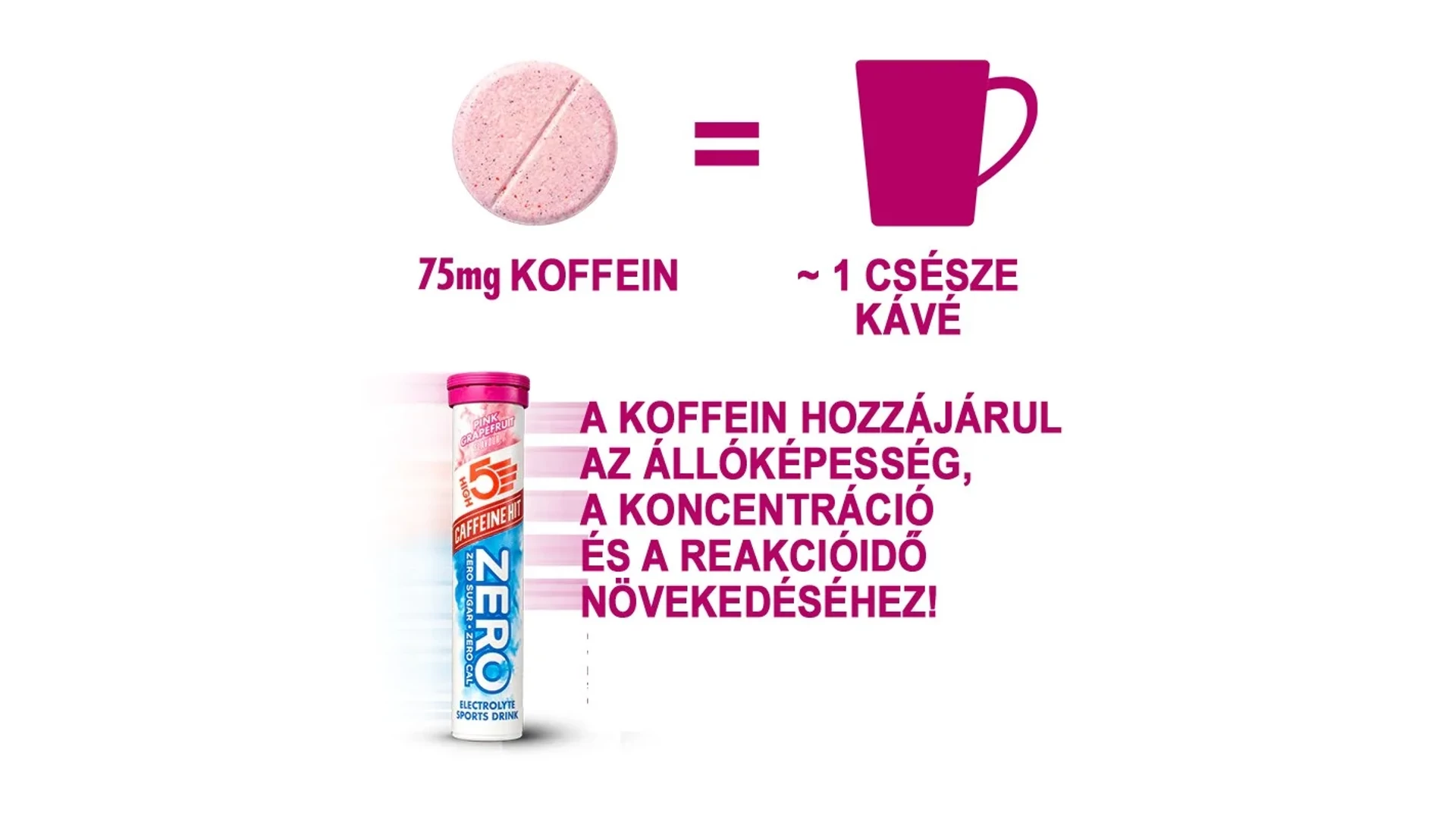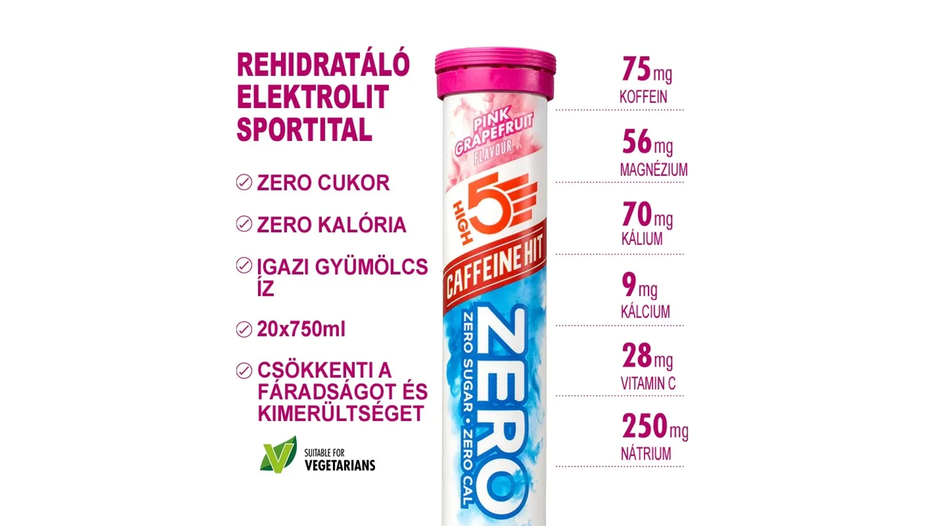 A High5 ZERO Caffeine HIT egy magas elektrolit tartalmú pezsgőtabletta 75mg hozzáadott koffeinnel, mely megfelelő arányban tartalmazza a sportolással elveszett ásványi anyagokat. ZERO cukor, ZERO szénhidrát, viszont elektrolitokban gazdag italt eredményez, magas nátrium és magnézium tartalommal, amely garantáltan megóv a görcsöktől.