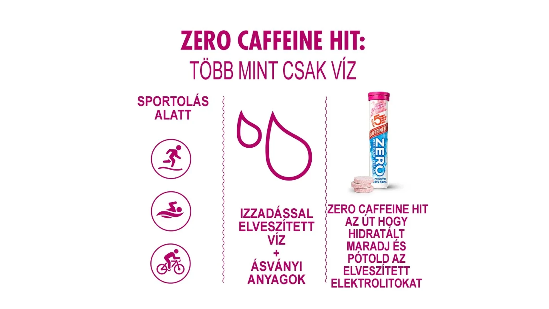 Mindegy mit sportolsz, mindegy milyen környezetben, csak tegyél egy tubus High5 ZERO Caffeine HIT-et a táskádba és maradj hidratált és éber. Különösen előnyös a nagy melegben, ahol a verejtékezéssel rengeteg ásványi anyagot vesztünk el. Hosszú tekeréseknél, vagy hosszantartó versenyeken csak dobd a zsebedbe, és változtass minden vízcsapot optimális hidratáló forrássá, a szénhidrátot meg pótold a Energy Gel vagy Energy Gel Aqua-val. A pezsgőtabletták azonnal oldódnak, hogy egy könnyű, frissítő, szénsavmentes italt biztosítsanak, magas elektrolit szinttel, bárhol, bármikor.