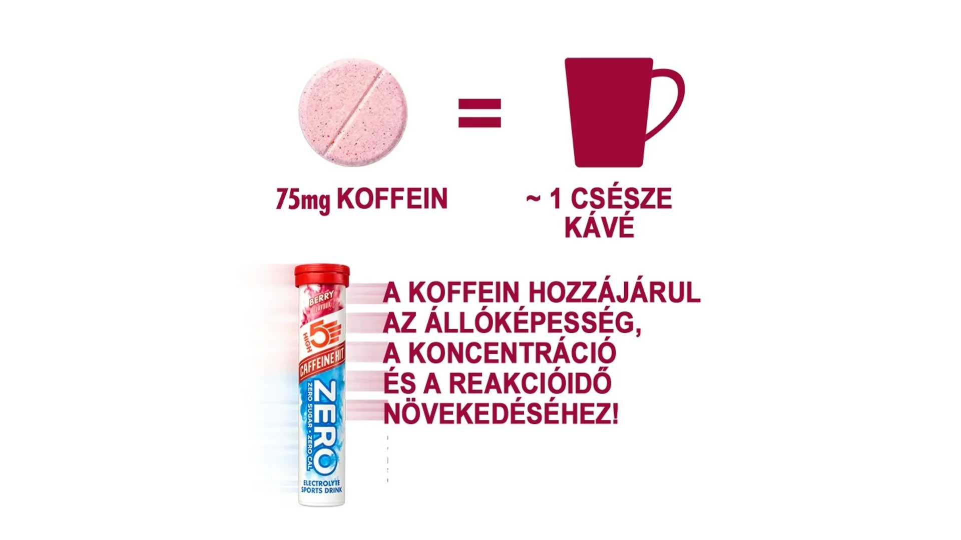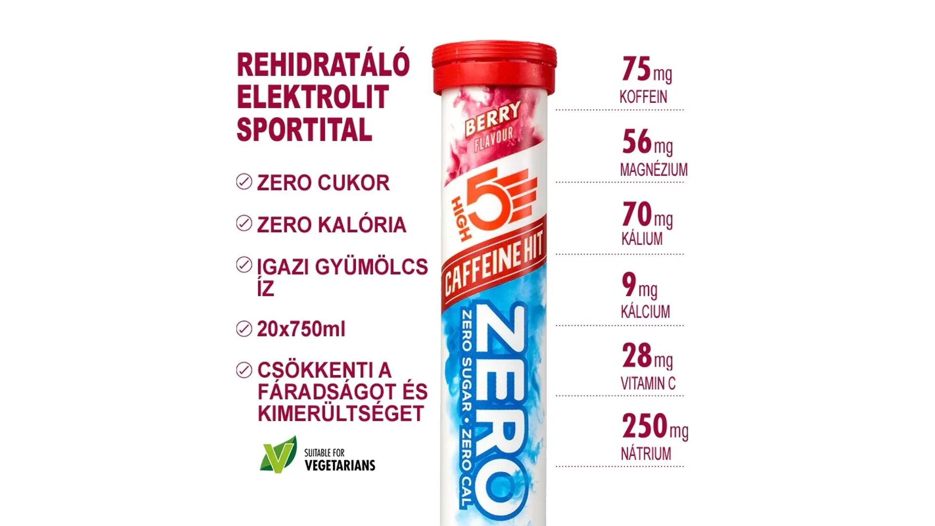 A High5 ZERO Caffeine HIT egy magas elektrolit tartalmú pezsgőtabletta 75mg hozzáadott koffeinnel, mely megfelelő arányban tartalmazza a sportolással elveszett ásványi anyagokat. ZERO cukor, ZERO szénhidrát, viszont elektrolitokban gazdag italt eredményez, magas nátrium és magnézium tartalommal, amely garantáltan megóv a görcsöktől.