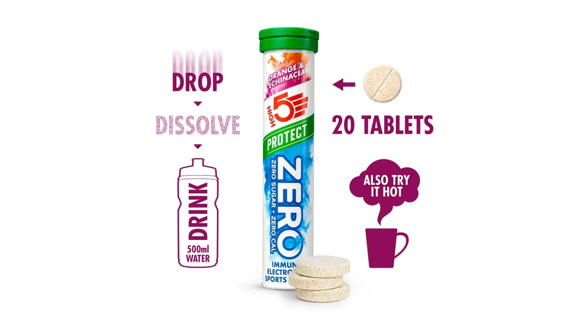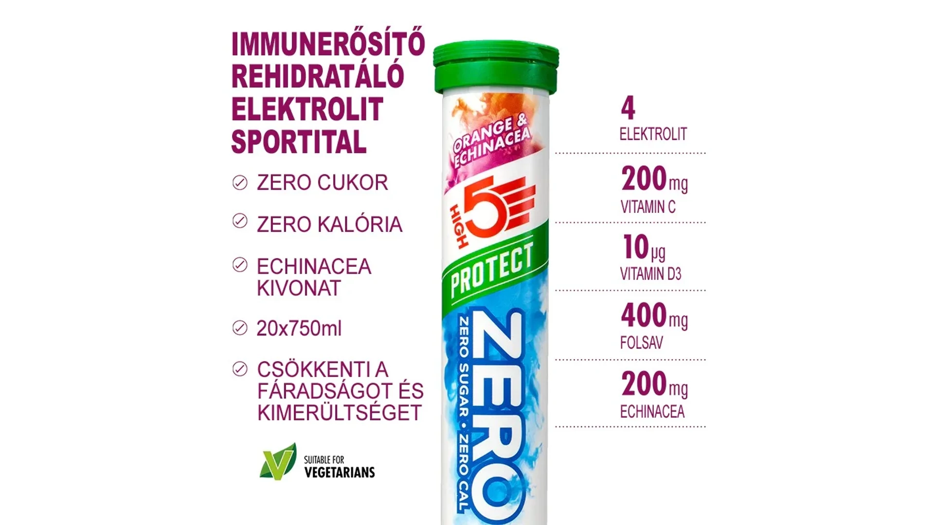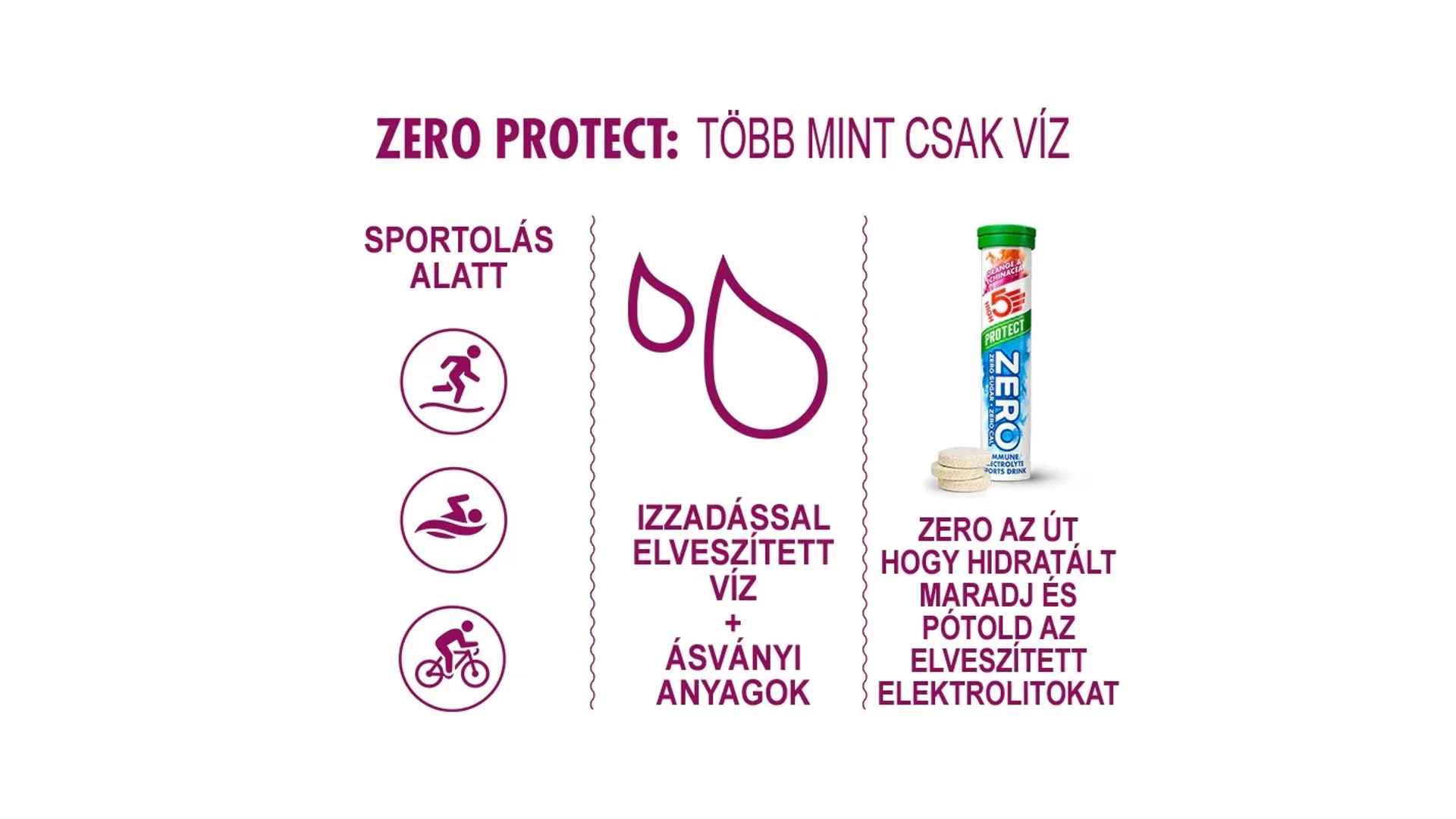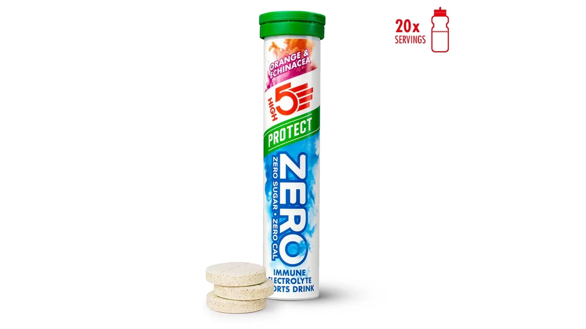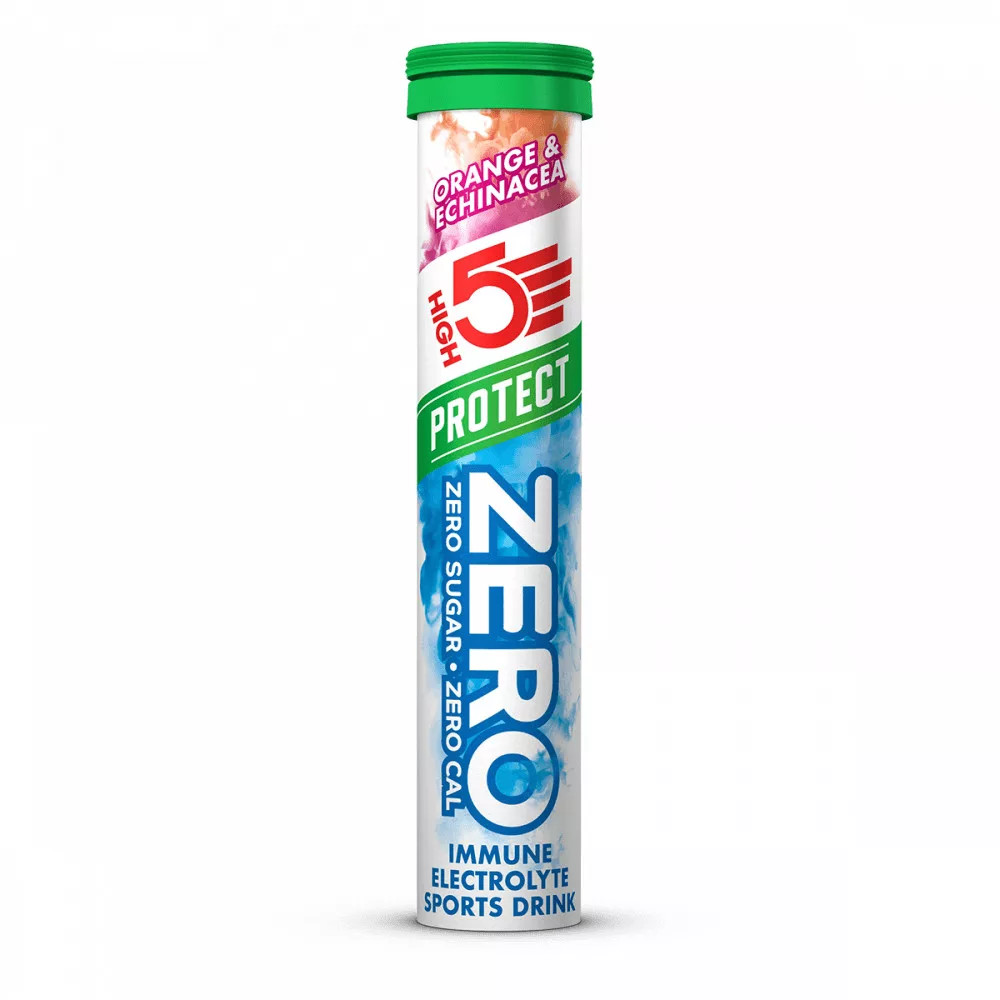 A High5 ZERO Protect egy új, magas elektrolit tartalmú pezsgőtabletta, melyet felturbóztunk növényi kivonattal és vitaminokkal amely kiegészíti a szervezet immunrendszerét az edzés alatt és után. ZERO cukor, ZERO kalória, viszont elektrolitokban gazdag italt eredményez, magas nátrium és magnézium tartalommal, amely garantáltan megóv a görcsöktől.
