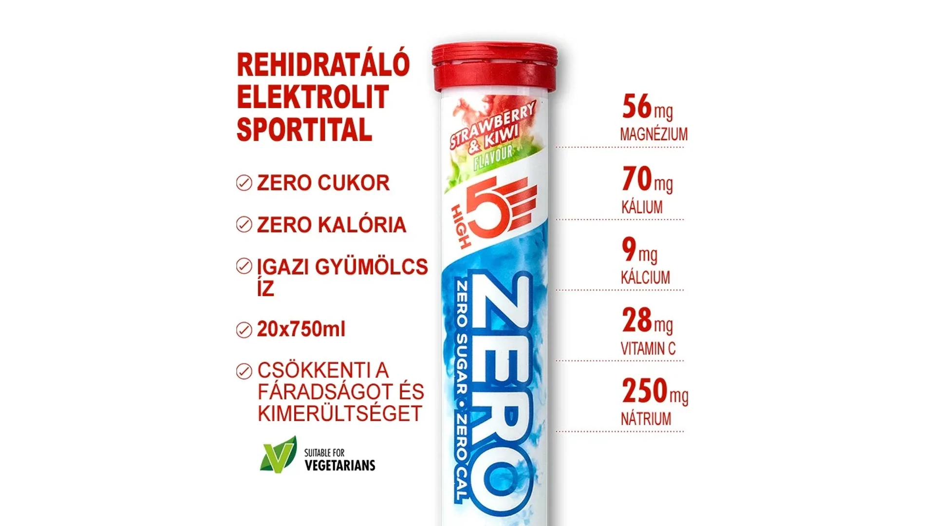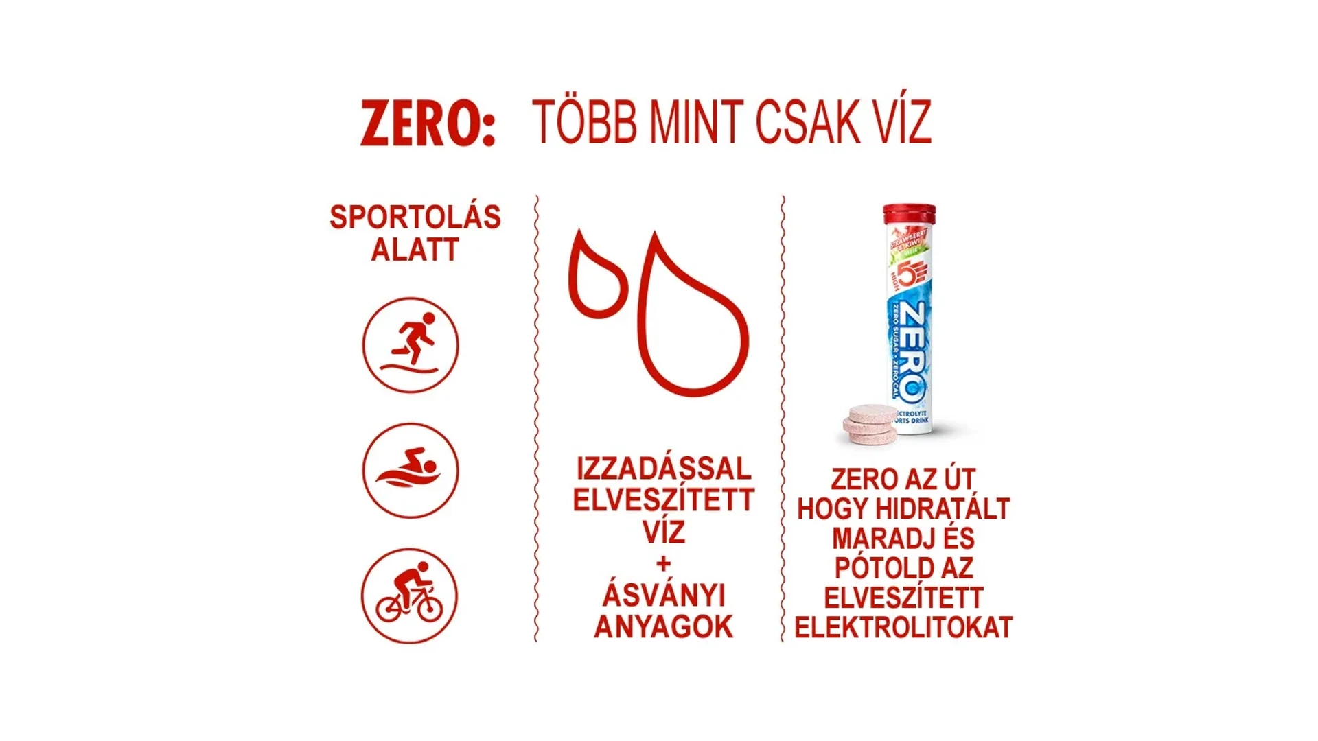 A High5 ZERO Sport egy magas elektrolit tartalmú pezsgőtabletta, mely megfelelő arányban tartalmazza a sportolással elveszített ásványi anyagokat. ZERO cukor, azaz ZERO szénhidrát, viszont elektrolitokban gazdag italt eredményez, magas nátrium és magnézium tartalommal, amely garantáltan megóv a görcsöktől.