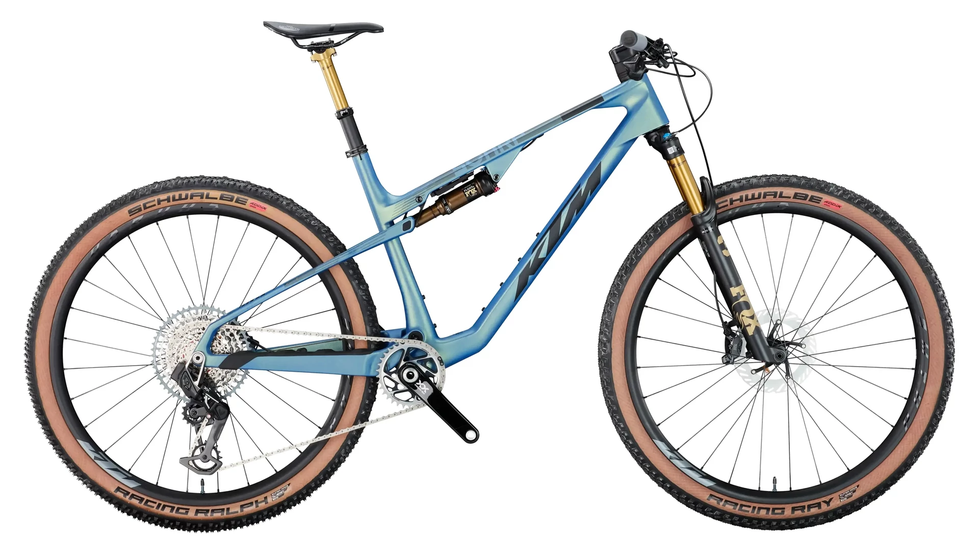A FOX 34SL Float Factory első villa és a FOX Float SL Factory hátsó rugóstag finoman hangolható, így mindig az adott terephez igazítható a felfüggesztés karaktere. A SRAM XX SL Eagle Transmission AXS váltórendszer vezeték nélküli technológiája azonnali, pontos váltást kínál extrém terhelés alatt is. A Shimano XT fékrendszer Freeza hűtéses tárcsákkal stabil és kiszámítható fékerőt biztosít, míg a karbon kerekek és a Schwalbe Racing Ray Evo SuperRace gumik a maximális hatékonyságot szolgálják.