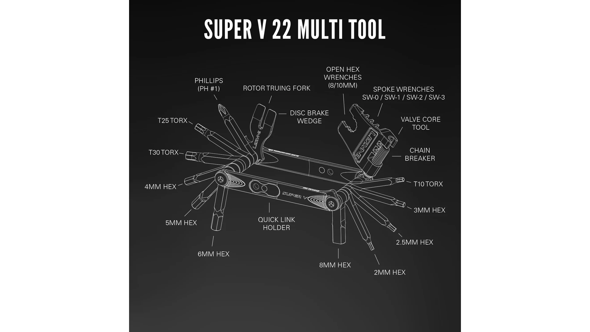 A CNC-megmunkált alumínium oldallemezek fekete eloxált felületet kaptak, nagyobb erőkart biztosítanak, valamint beépített mágneses tartót is tartalmaznak egy tartalék gyorsszem számára. A két elérhető változattal és az összetéveszthetetlen Lezyne dizájnnal a könnyű Super V szerszámok kiváló funkcionalitást kínálnak minden kerékpáros számára.