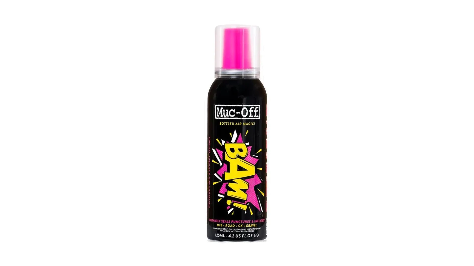 Muc-Off B.A.M! Instant defektjavító gyorsan felfújja és kijavítja az akár 4 mm-es defekteket is azáltal, hogy latexhabot és levegőt fecskendez be közvetlenül a gumiabroncsba vagy a belsőbe.