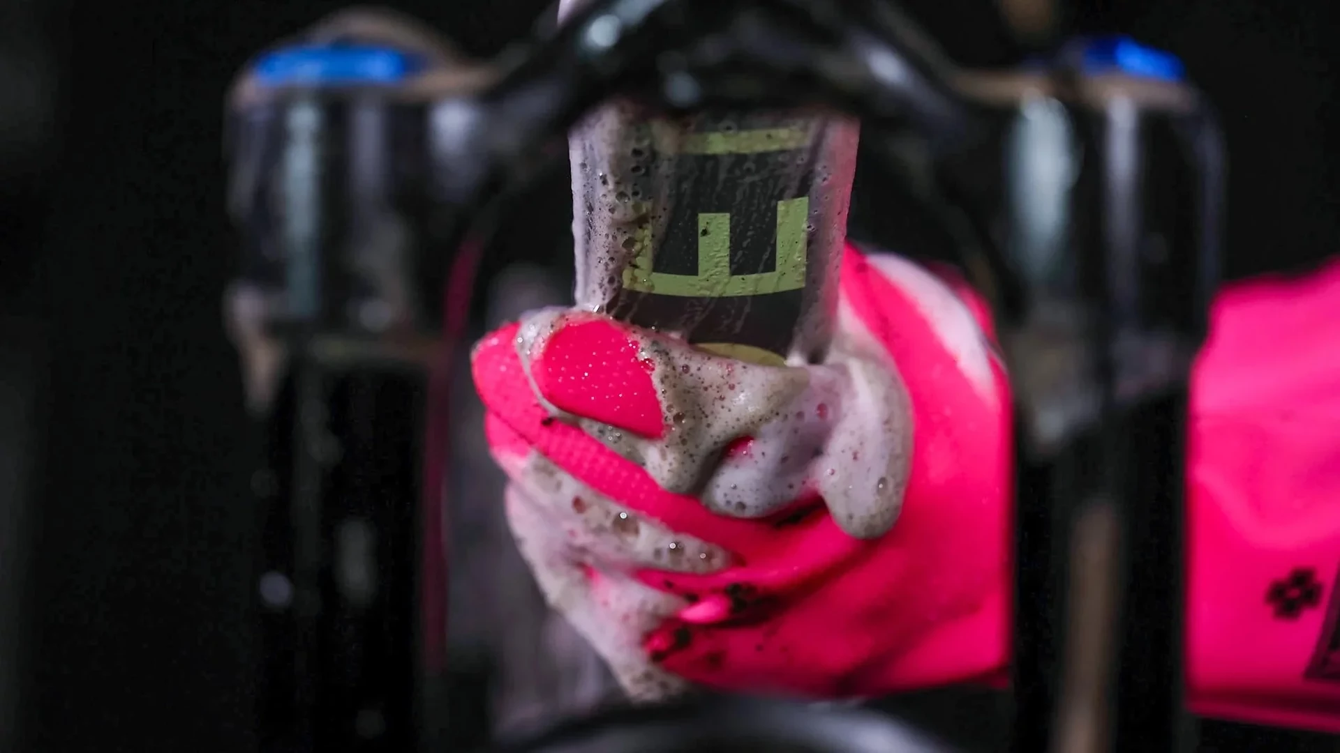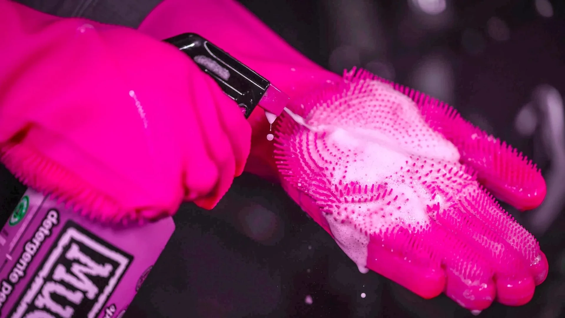 Csak permetezze a kerékpártisztítót vagy a habot a tisztítandó területre vagy közvetlenül a kesztyűre, és súrold le a kerékpárod.