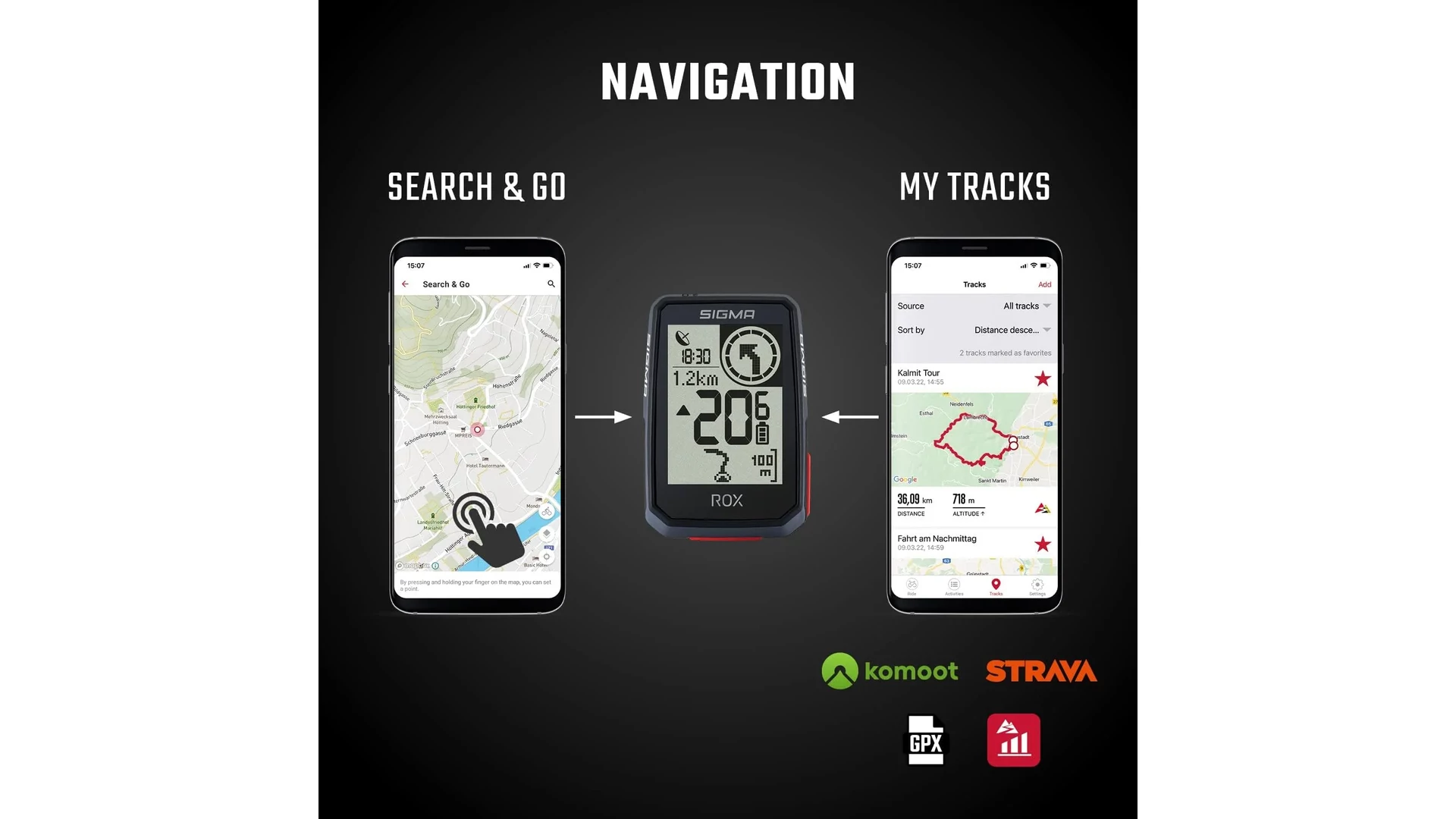 Csatlakoztasd a ROX 2.0-t a Komoot alkalmazáshoz, és hagyd okostelefonod a zsebedben. Ezután részletes turn-by-turn navigációt ad a ROX 2.0 Komoot alkalmazásából, amely nyíl iránymutatóként jeleníthető meg a kijelzőn vagy a Vörös Körön belül. Ez a kör a kijelzőn színesen van kiemelve, és a következő fordulópontok távolságát színes sávként jeleníti meg, amely a fordulópont közeledtével rövidül de mellette megjeleníti a hátralévő távolságot méterben is.
