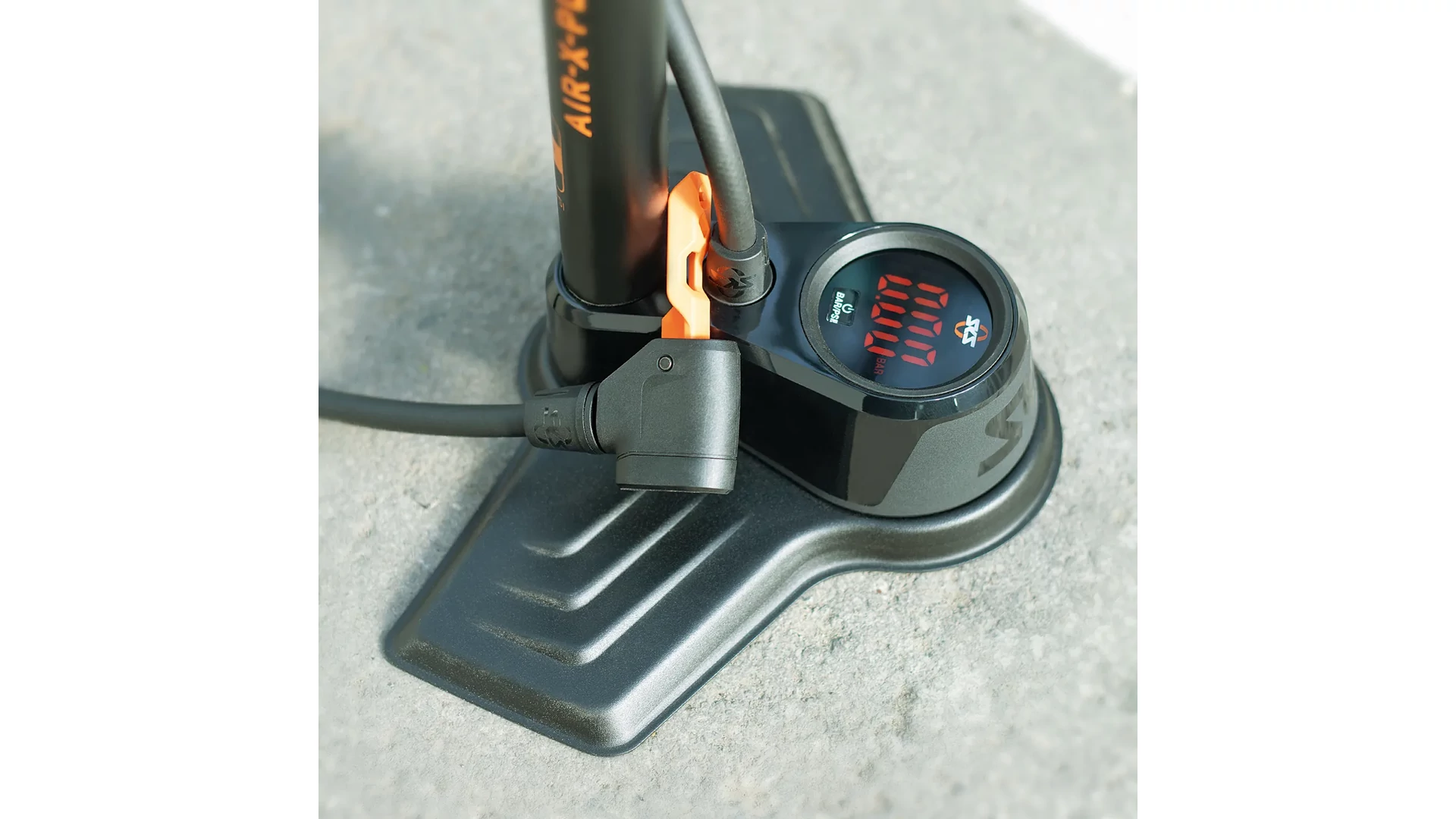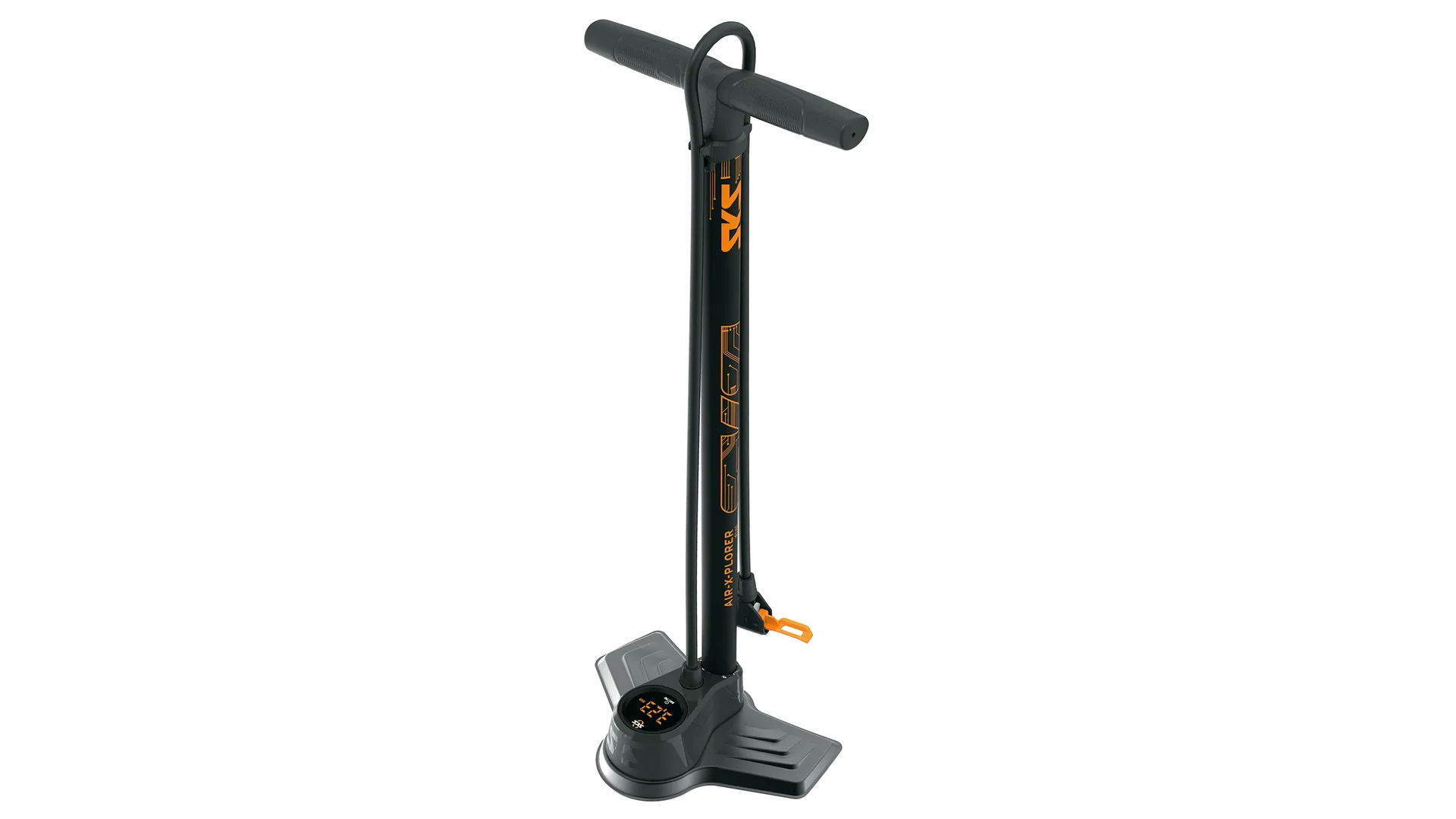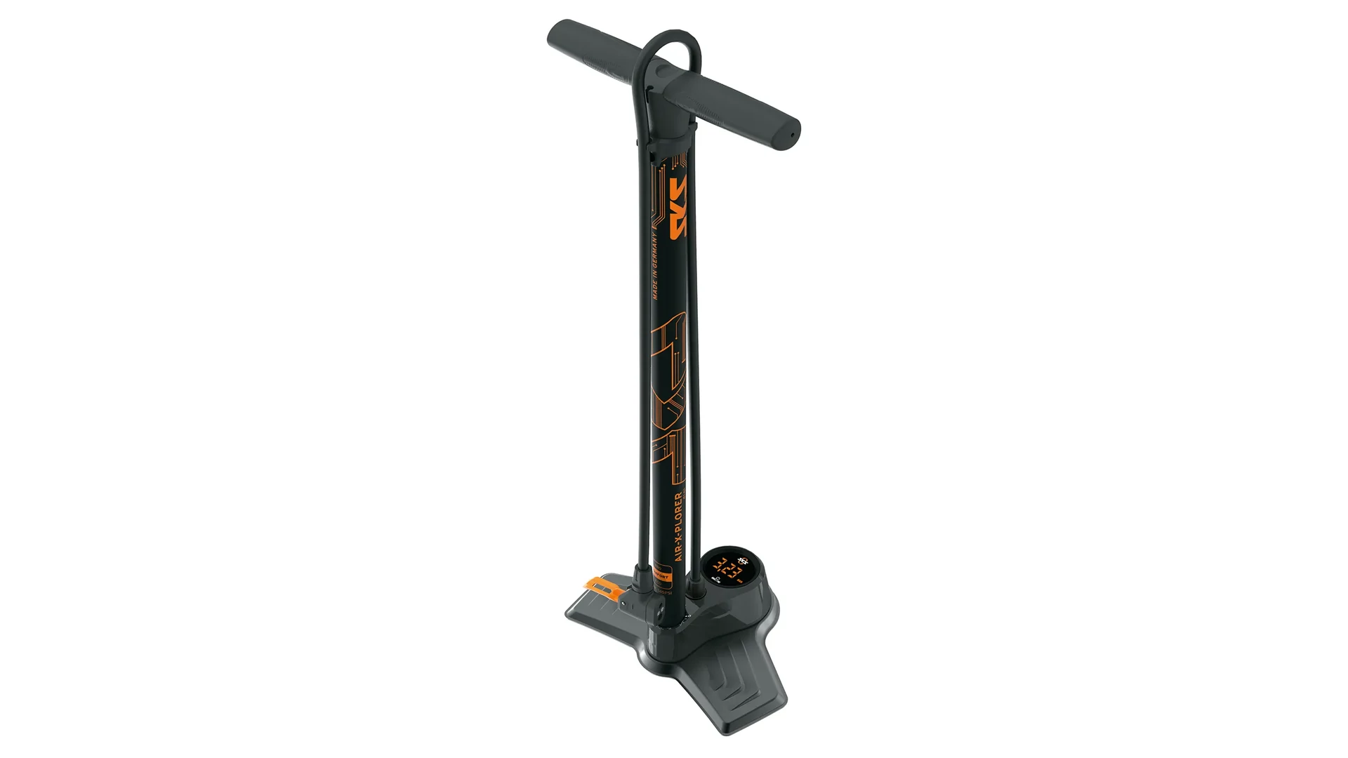 Precíz: az SKS Air-X-Plorer Digi 10.0 állópumpa kiváló minőségű, LED-es digitális nyomásmérő órával nyűgöz le. Az első osztályú szenzortechnológia nagy mérési pontosságot garantál, és akár 10 bar nyomásig is pontos értékeket szolgáltat.