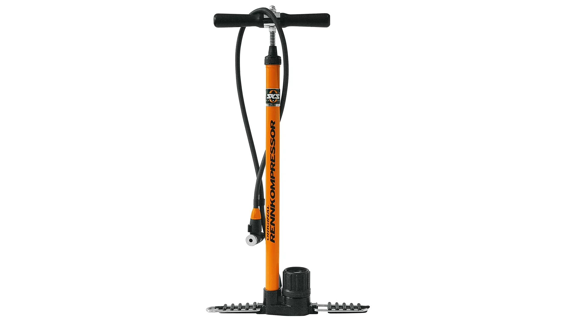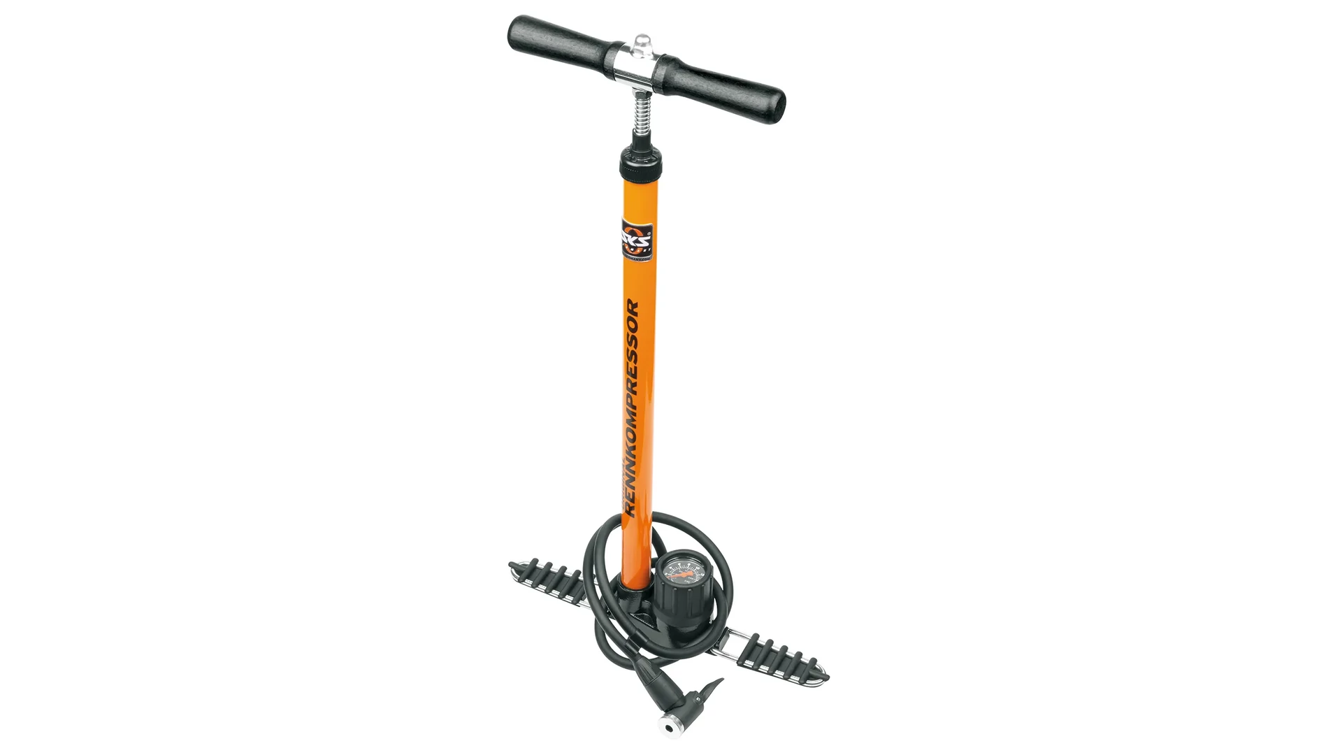 Az állópumpa az ikonikus SKS narancssárga színben készül, és opcionálisan két különböző szelepcsatlakozással érhető el: E.V.A. fejjel vagy a továbbfejlesztett "MV EASY" MULTI VALVE fejjel. A nagy teljesítményű pumpa akár 16 bar / 230 psi nyomásig képes felfújni a kerékpárgumikat.