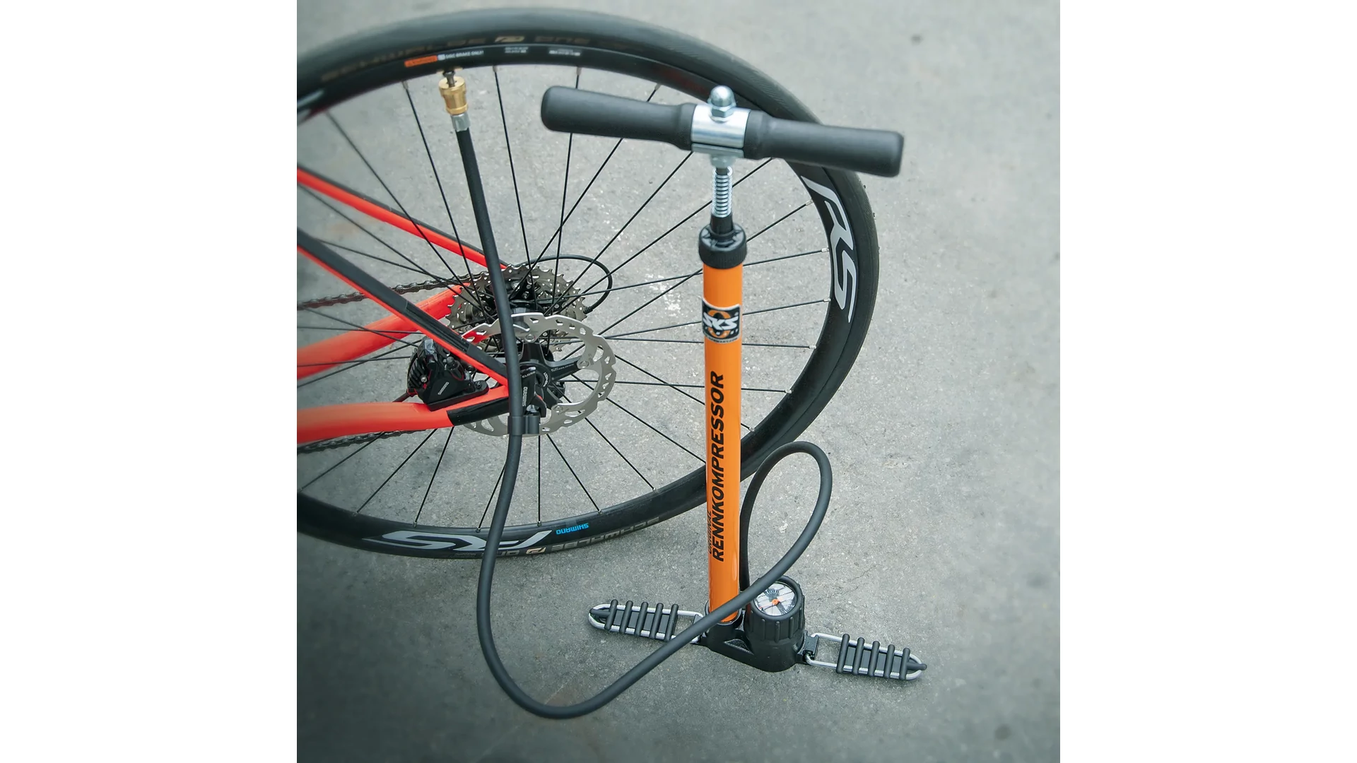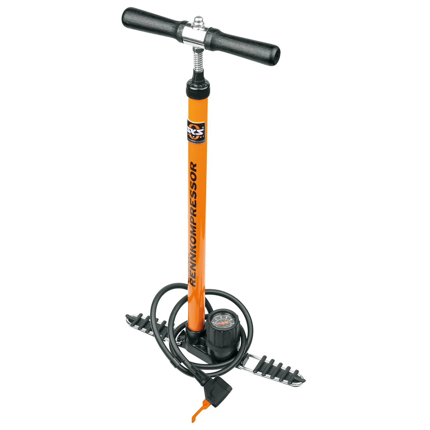 A Rennkompressor több, mint 50 éve a nemzetközi kerékpározás egyik legnépszerűbb pumpája, és minden kerékpáros állópumpa egyetlen, valódi ősének tekinthető. A tömör fémcső, az öntöttvas talp, a precíz nyomásmérő óra és a fekete fa fogantyú a legjobb "Made in Germany" minőség bizonyítékai. A lábak felhajthatók, így a pumpa szállítása is egyszerűbb.