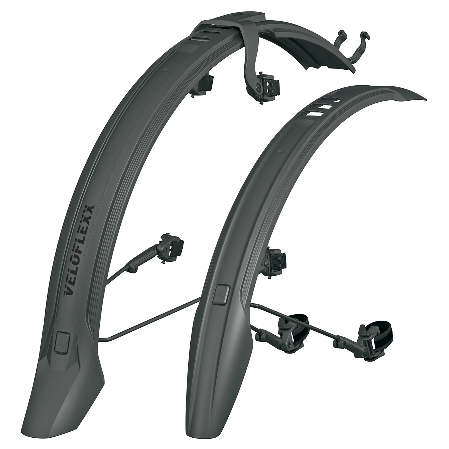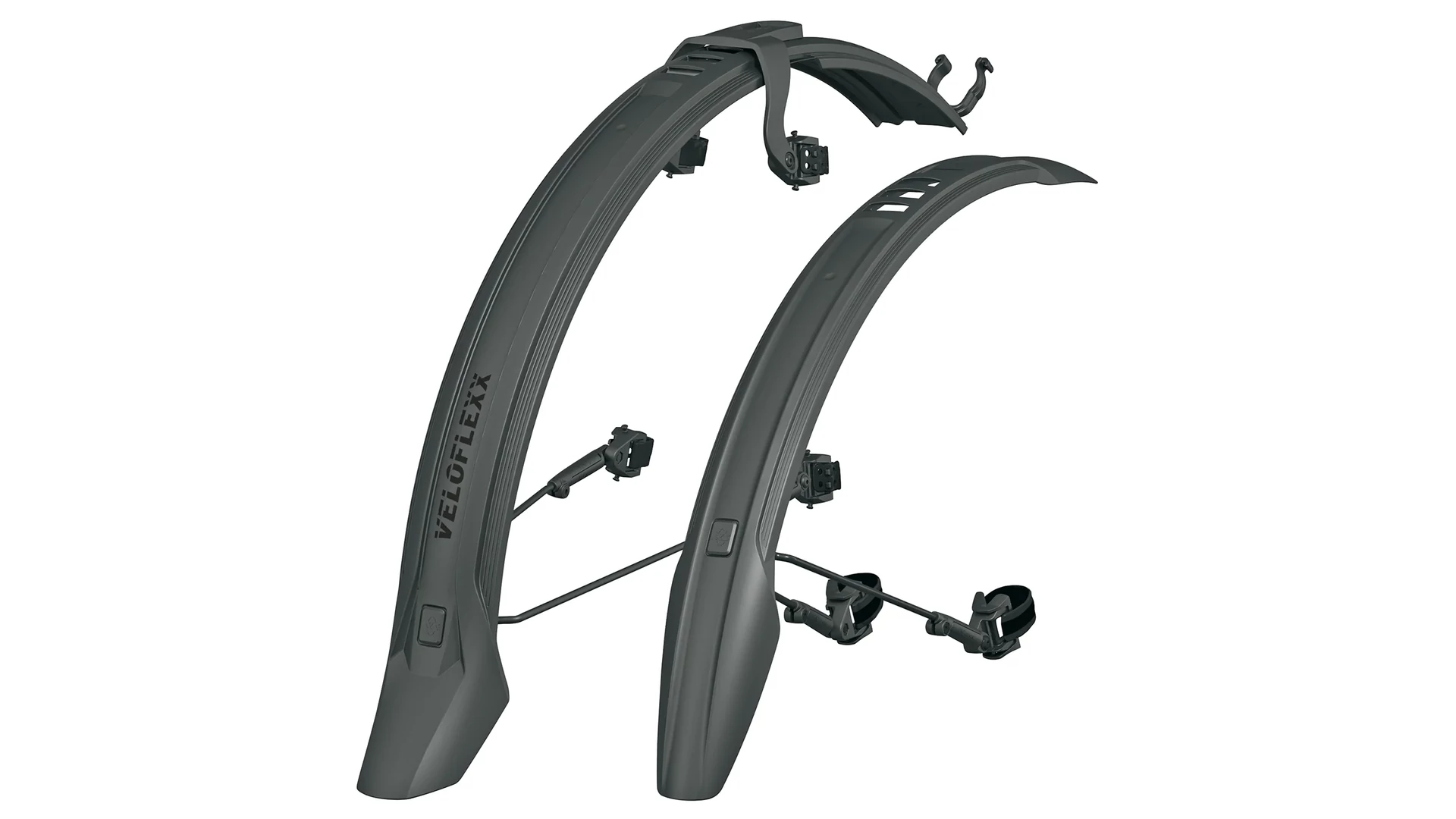 Új tag a Velo családban: a nagy ütésállóságú, csúcsteljesítményű műanyagból készült Veloflexx sárvédő szett ötvözi a fix sárvédők stabilitását a csíptethető sárvédők rugalmasságával. A Veloflexx híd lehetővé teszi, hogy a hátsó sárvédőt szerszám nélkül, gumipántok segítségével a támvillák felső részére rögzítsd. Ha a tárcsafékek ellenére merevítő található a támvillák között, a gumi és a merevítő közötti távolságnak legalább 30 mm-nek kell lennie a Veloflexx sárvédő kompatibilitásához.